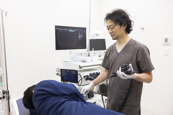 経鼻内視鏡では、鼻からカメラを挿入するため、舌の根元に触れることがなく、嘔吐反射が起こりにくいのが特徴です。また、鼻だけに麻酔を使用するため、検査中でも医師や看護師と会話ができ、安心感が高まります。